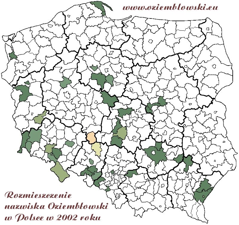 прізвища Озембловські (Оziembłowski) На карті показано поширення прізвищ ОЗІЕМБЛОВСЬКІ (OZIEMBŁOWSKI) в Польщі у 2002 році згідно повітів. Ці дані взяті з електронної версії (на CD) «СЛОВНИКА ПРІЗВИЩ ВЖИВАНИХ В ПОЛЬЩІ НА ПОЧАТКУ XXI СТОЛІТТЯ» ["SŁOWNIK NAZWISK UŻYWANYCH W POLSCE NA POCZĄTKU XXI WIEKU"] (опрацьованого проф. Казимиром Римутом (Kazimierz Rymut), а виданого Польською Академією Наук, Інститутом Польської Мови в Кракові у 2003 році. В 2002 році в Польщі було 315 повітів i 65 міст на правах повітів. Такий розподіл в словнику К. Римута був набагато докладнішим, ніж опублікованим автором 1992-1994 роках десятитомовим «Словнику прізвищ вживаних в Польщі» ("Słownik nazwisk współcześnie w Polsce używanych"), де прізвища вказані на тлі давних 49 воєводств. Теперішня карта нарисована на основі кількісних даних з праці К. Римута з 2003 року, а також використанням спеціально написаного скрипту доступного на сторінках Genpolu. Якщо даний повіт має біле тло, то в 2003 році ніхто не проживав там з таким прізвищем (кількісні дані проф. К. Римут черпав на підставі бази PESEL (в Україні ідент. код), яка охоплює всіх мешканців в Польщі). Якщо повіт темнозеленого кольору, то там проживало від 1 до 5 осіб. Градація кольорів - що 5 осіб, ток як показано на смужці нижче карти. Конкретна кількість осіб проживаючих в даному повіті (сумарно і окремо мужчини та жінки) у зменшенні кількості осіб є під картою. Переклад з польської Осипа Озімбловського, Любов Озімбловської