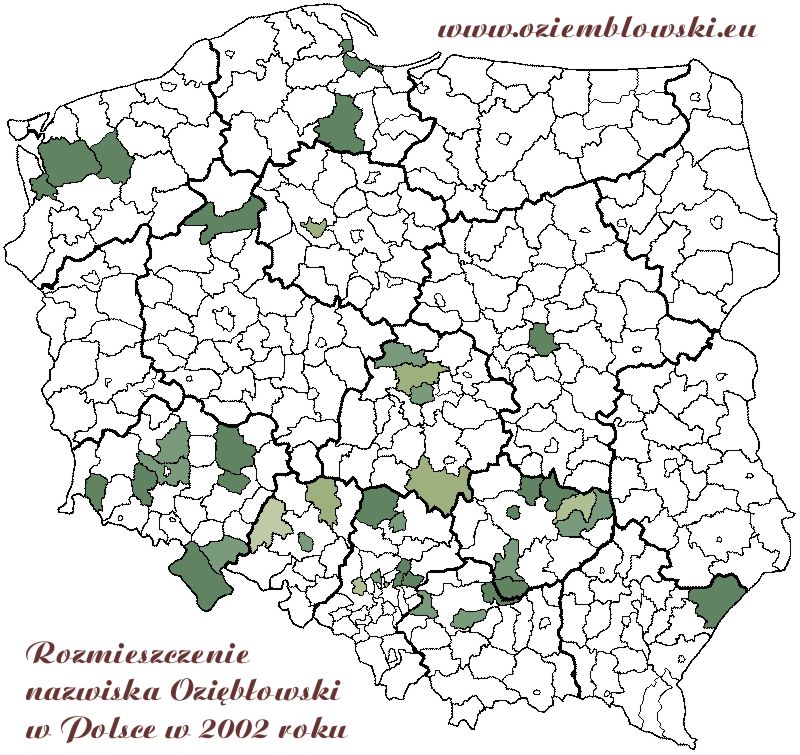 nazwiska Oziębłowski w Polsce w 2002 roku Na poniższej mapie pokazano rozmieszczenie nazwiska OZIĘBŁOWSKI w Polsce w 2002 roku według powiatów. Dane liczbowe pochodzą z zakupionej przeze mnie elektronicznej wersji (na CD) "SŁOWNIKA NAZWISK UŻYWANYCH W POLSCE NA POCZĄTKU XXI WIEKU" opracowanego przez prof. Kazimierza Rymuta, a wydanego przez Polską Akademię Nauk, Instytut Języka Polskiego w Krakowie w 2003 roku. W roku 2002 w Polsce było 315 powiatów i 65 miast na prawach powiatów. Podział taki przyjęty w słowniku Rymuta był więc znacznie dokładniejszy niż w opublikowanym przez niego w latach 1992-1994 dziesięciotomowym "Słowniku nazwisk współcześnie w Polsce używanych", gdzie występowanie nazwisk ukazano na tle dawnych 49 województw. Mapa niniejsza została wykreślona na podstawie danych liczbowych z pracy Rymuta z 2003 roku oraz z wykorzystaniem specjalnie napisanego skryptu dostępnego ma stronach Genpolu. Jeżeli dany powiat posiada biały obszar, to w 2002 roku nikt o takim nazwisku tam nie mieszkał (dane liczbowe prof. Rymut czerpał na podstawie bazy PESEL obejmującej wszystkie żyjące w Polsce osoby). Jeżeli powiat ma barwę ciemnozieloną to mieszkało tam od 1 do 5 osób. Gradacja barw jest co 5 osób tak jak to przedstawiono na pasku poniżej mapy. Szczegółowa liczba osób zamieszkujących dany powiat ("łącznie" oraz osobno "mężczyźni" plus "kobiety") podana jest malejąco pod mapą.